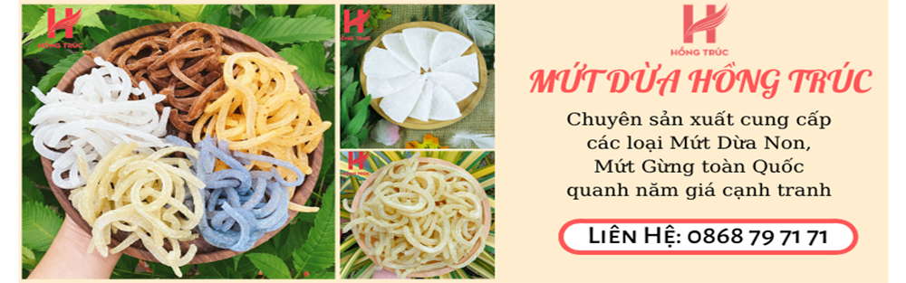 Mứt dừa non được làm 100% từ cơm dừa non và đường cát trắng, không phẩm màu, không hóa chất gây hại cho sức khỏe người tiêu dùng. Mứt dừa non có độ dẻo dẻo, dai dai và vị ngọt thanh. Và còn có các hương vị khác nhau để phù hợp với khẩu vị ăn của từng người nữa.
